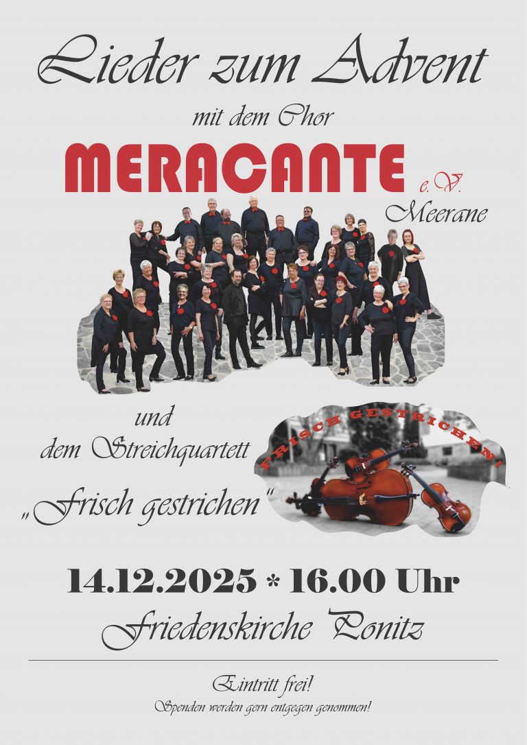 Gemeinsam mit dem Streichquartett „Frisch gestrichen“ möchten wir Euch am 14. Dezember 2025 um 16:00 Uhr in der Friedenskirche Ponitz auf eine musikalische Reise durch die Adventszeit mitnehmen. Es erwartet Euch ein stimmungsvolles Programm voller festlicher Klänge und besinnlicher Momente.